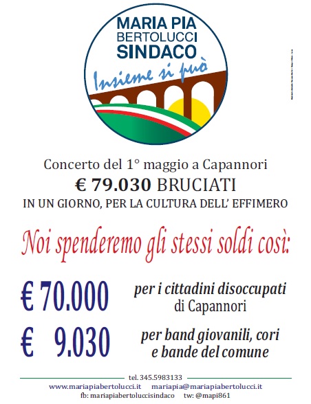 Noi di "Insieme si può" abbiamo altre proposte: utilizzare questi soldi parte per persone che ne hanno realmente bisogno e parte per incentivare e rafforzare le band giovanili e cori di Capannori in modo che questi soldi restino sul territorio.