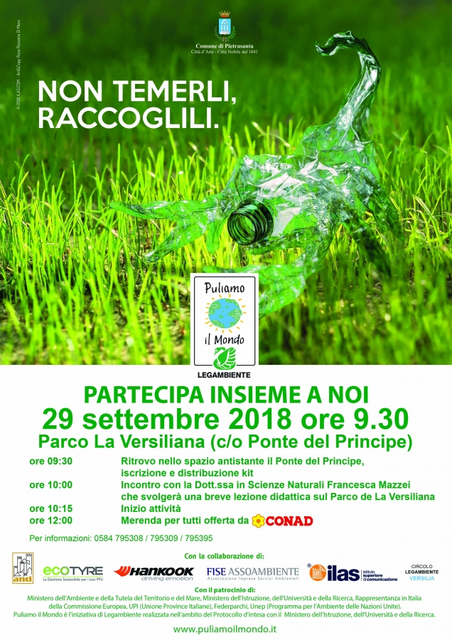 Protagonisti gli studenti delle scuole elementari pietrasantine insieme ai loro insegnanti e genitori per una lotta senza quartiere contro i rifiuti abbandonati. Il punto di ritrovo sarà , per tutti, sabato 29 settembre, alle ore 9.30 di fronte al Ponte del Principe dove i volontari di Legambiente raccoglieranno le iscrizioni e distribuiranno il famoso kit composto da pettorina, cappello e sacchetto. "Abbiamo deciso in accordo con Legambiente – spiega Elisa Bartoli, Assessore all'Ambiente – di concentrare l'azione dei volontari sulla nostra Versiliana nei confronti del quale stiamo dedicando risorse, tempo e progetti. L'obiettivo è rendere migliore il nostro territorio grazie alla pulizia e alla raccolta dei rifiuti dei soliti incivili e maleducati ma anche – spiega ancora – avvicinare i nostri bambini alla bellezza e alla cura del nostro polmone verde più importante. L'iniziativa è aperta ovviamente a tutti: agli studenti, che abbiamo coinvolto, ma anche ai cittadini che hanno voglia e piacere di dedicare un po' del loro tempo ad un'attività che fa bene a tutti". In programma l'incontro con la guida e docente di Scienze Naturali, Francesca Mazzei per una breve lezione di didattica sul parco della Versiliana. Inizio attività alle ore 10.15. E per tutti, dopo la fatica, la merenda offerta come ogni anno da Conad.