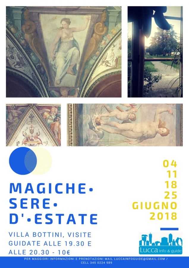 All'interno del calendario di eventi e manifestazioni ViviLucca 2018, Villa Bottini apre le sue porte tutti i lunedì sera per farvi immergere in epoche ormai lontane. Attraverserete la storia della Villa e di chi vi ha vissuto tra intrighi e artistici suggerimenti... scoprirete il fascino del 'giardino all'italiana', di un ciclo di affreschi del XVI pressoché unico e dal significato interessante e infine di moderne opere... e se sarete fortunati, potrete anche incontrare qualche nobile dama!