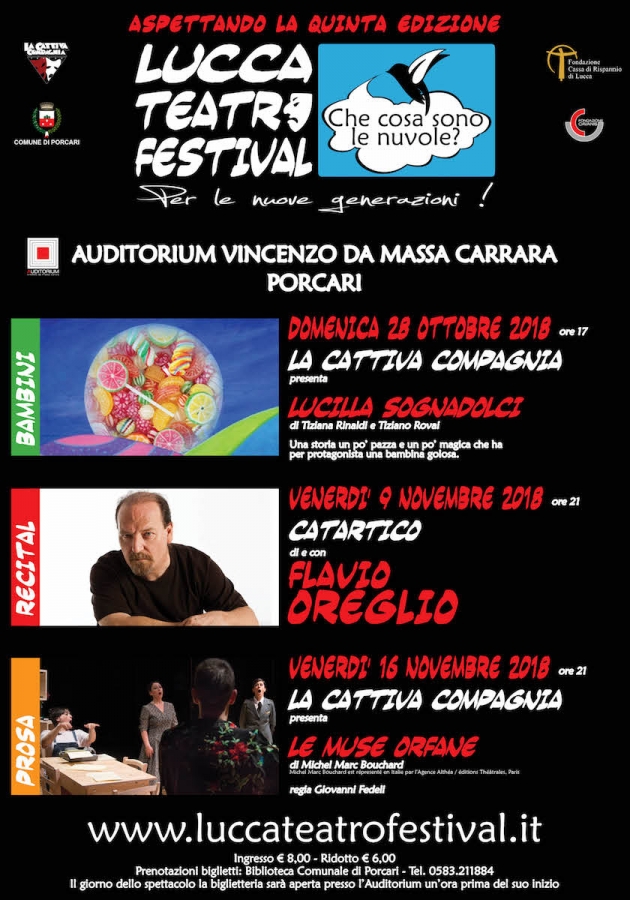 Ai nastri di partenza la Stagione Teatrale e Musicale dell'Auditorium "Vincenzo Da Massa Carrara" di Porcari, organizzata dal Comune di Porcari e dalla Fondazione Cavanis. All'interno del ricco cartellone, La Cattiva Compagnia propone tre spettacoli “Aspettando il Lucca Teatro Festival_Che cosa sono le nuvole?” edizione 2019.