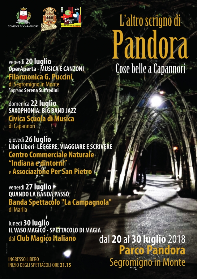 “Il titolo 'L’altro scrigno di Pandora' - spiega Andrea Petretti, presidente della Filarmonica 'G.Puccini' di Segromigno in Monte - vuole evocare il mito del vaso di Pandora che si narra racchiudesse i mali del mondo, mentre a Segromigno c’è un contenitore Pandora che invece dispensa “cose belle”: la volontà è quindi di aprire questo vaso e far uscire le cose belle in modo che tutti ne possano godere, divertendosi e socializzando. Auspichiamo una grande partecipazione di pubblico e soprattutto che questa idea possa diventare un appuntamento fisso per l’estate segromignese e che possa via via accogliere quanti più soggetti possibili”.