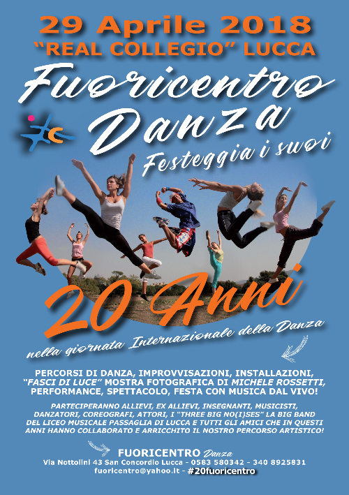 Tornano da tutta Europa per la Giornata Internazionale della Danza. Saranno ospiti speciali della Festa per i 20 anni del centro culturale Fuoricentro, domenica 29 aprile al Real Collegio, 5 ex allievi che oggi danzano a livello internazionale: Gianluca Girolami, Elisa D'Amico, Daniela Querci, Stefano De Luca e Maria Novella Tattanelli.