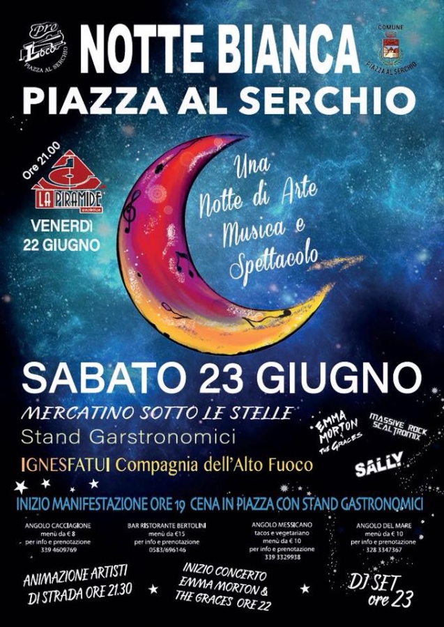Tutti gli eventi si svolgeranno lungo l'asse via Roma-Piazza Giovanni XXIII-Piazza Bechelli. Si parte alle 19 con il Mercatino sotto le stelle e la cena in piazza con gli stand gastronomici. Alle 19.30 ‘aperitivity’. Alle 20 inizierà la cena con accompagnamento musicale. Ci sarà la possibilità di scegliere tra 4 tipologie di menù: dall’angolo cacciagione (8 euro, info e prenotazioni 3394609769), a quello offerto dal bar ristorante Bertolini (15 euro solo su prenotazione 0583696146), passando per l’angolo messicano tacos e vegetariano (10 euro info e prenotazioni 3393329938), e l’angolo del mare con il menù da 10 euro (info e prenotazioni 3283347367). La serata proseguirà alle 21,30 con l’animazione e gli artisti di strada di IGNESFATUI Compagnia dell’alto fuoco. Alle 22 il pubblico potrà assistere al concerto di Emma Morton & the Graces. L’artista porterà sul palco il suo ultimo album ‘Bitten’ by the Devil, uscito lo scorso 11 maggio. Dalle 23, infine, musica, balli e divertimento fino a tarda notte con i Dj set di Massive Rock & Scaltromix con la partecipazione di Sally Vox.