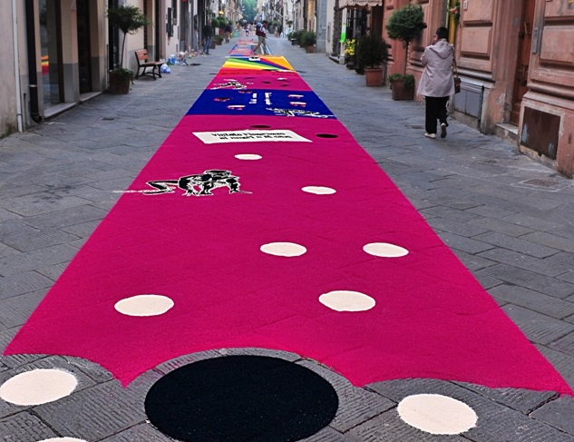 Quest’anno il tema scelto dai quattordici gruppi di tappetari, che rappresentano le contrade della città di Camaiore, è quello di San Bernardino da Siena: la modernità del santo.