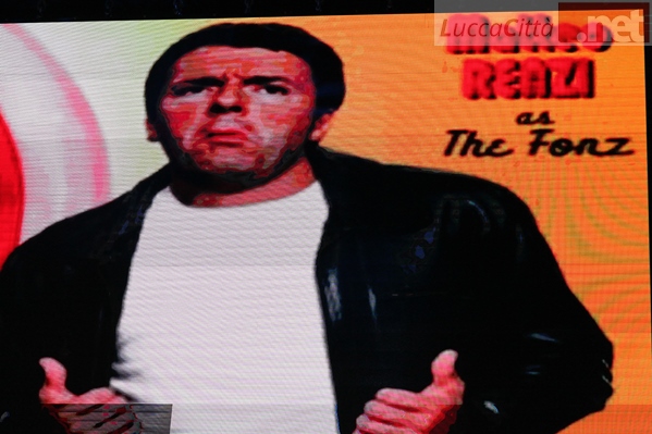 Primo argomento affrontato con la sua tipica ironia, ovviamente, il mondo della politica, con un Renzi in versione Fonzie di "Happy Days" sullo sfondo.