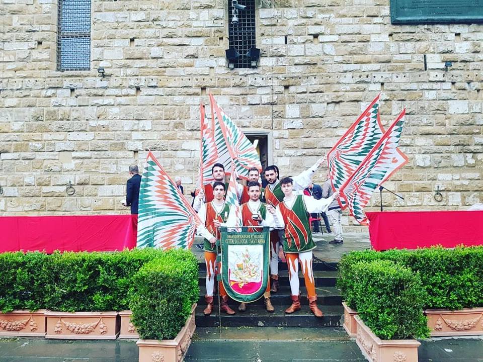 La formazione lucchese, già selezionata per la passata edizione annullata per il maltempo, ha avuto il privilegio di portare in una delle più belle piazze d’Italia la maestria nel gioco della bandiera riuscendo ad aggiudicarsi il primo posto nella gara di Piccola Squadra eseguita sotto la pioggia incessante da Gianluca MAZZONI, Matteo BROGI, Federico DEGL’INNNOCENTI, Luca CITARELLA ed Emanuele LUCCHESI accompagnati dai musici Venturini Michele , Bertini Laura, Graziani Giulia, Hagelstein Gil, Lucarotti Francesca, Nannini Elisa, Notari Flavio, Pelletti Arianna, Letizia, Urbani Leonardo, Rossi Diana e Lippi Vittorio.
