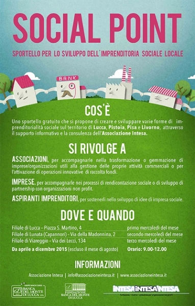 Gli sportelli “Social Point” sono disponibili presso le filiali della Banca del Monte di Lucca di: a Lucca (piazza San Martino, 4) il primo mercoledì del mese, a Lunata (Capannori, via della Madonnina, 2) il secondo mercoledì del mese e a Viareggio (via dei Lecci), il terzo mercoledì del mese, nella fascia oraria 9 – 12, fino a dicembre 2015 (ad eccezione del mese di agosto).