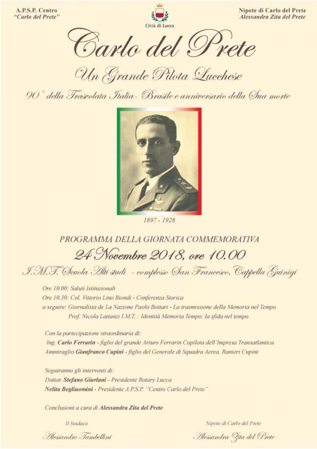 Si svolgerà sabato prossimo 24 novembre dalle ore 10 nella cappella Guinigi del Complesso di San Francesco a Lucca una giornata commemorativa in occasione del 90esimo anniversario dalla trasvolata Italia – Brasile e morte dell'insigne aviatore lucchese Carlo Del Prete.