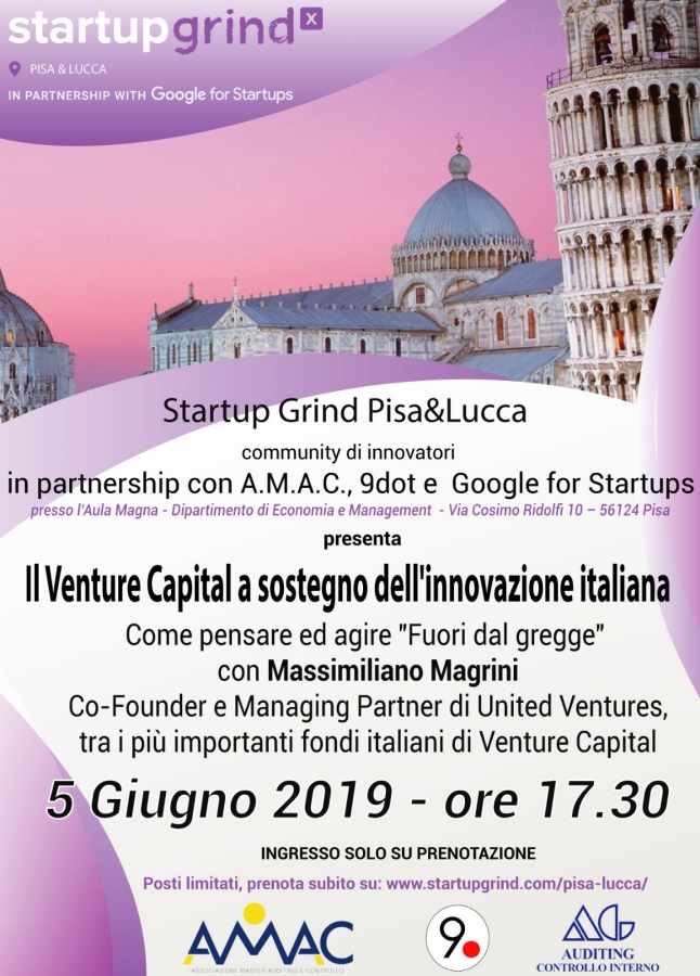 A partire dalle 17:30, appuntamento nell’Aula Magna del Dipartimento di Economia e Management dell’Università di Pisa con “Il Venture Capital a sostegno dell’innovazione italiana. Come pensare ed agire Fuori dal gregge”, il nuovo evento della community per gli innovatori toscana in partnership con Google for Startups. L’iniziativa è realizzata in collaborazione con AMAC (Associazione Master Auditing e Controllo), Master in Auditing e Controllo Università di Pisa e 9dot, azienda italiana specializzata nella progettazione e produzione di soluzioni legate all’implementazione di nuovi sistemi di energia. Il pomeriggio si aprirà con i saluti istituzionali di Giuseppe D’Onza, Professore Ordinario presso il Dipartimento di Economia e Management dell’Ateneo pisano.