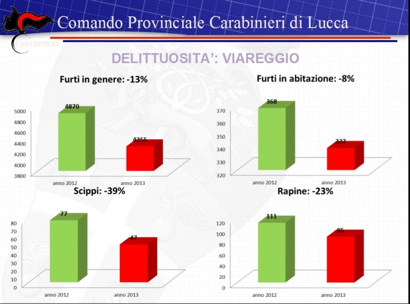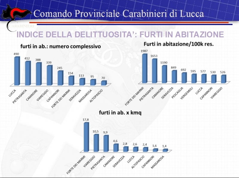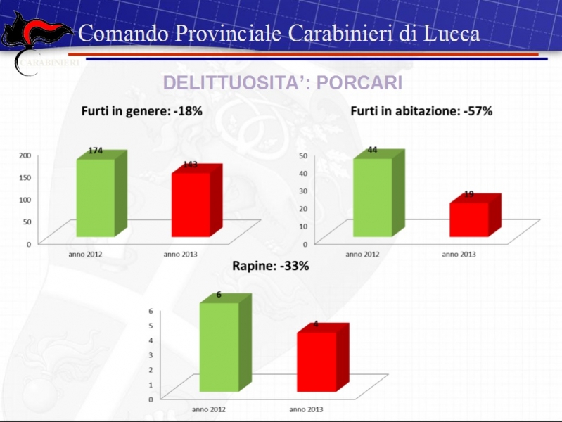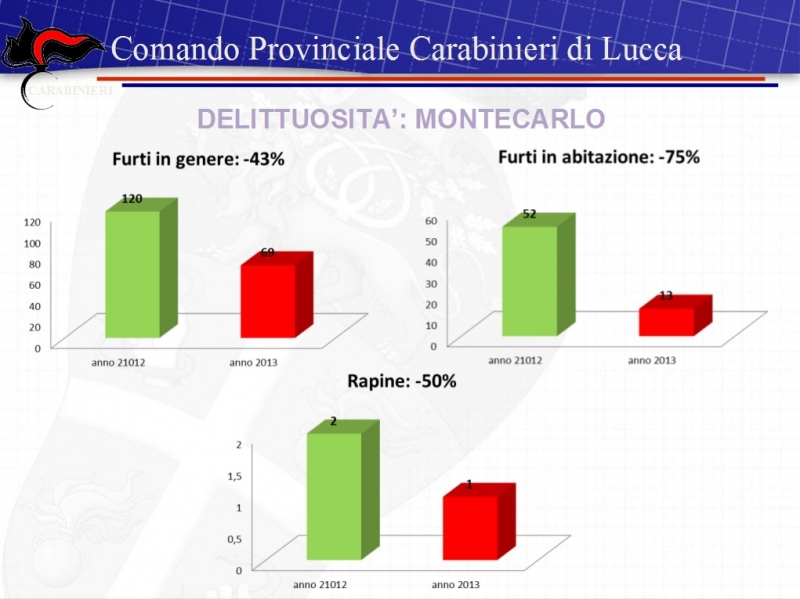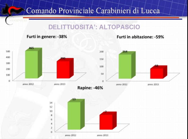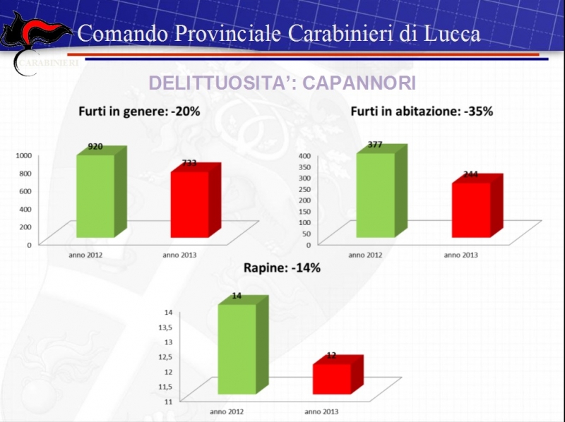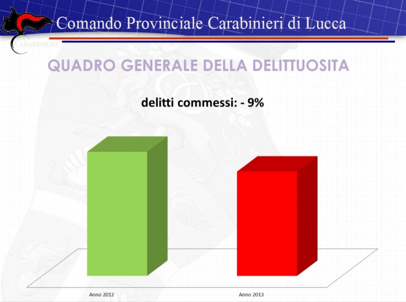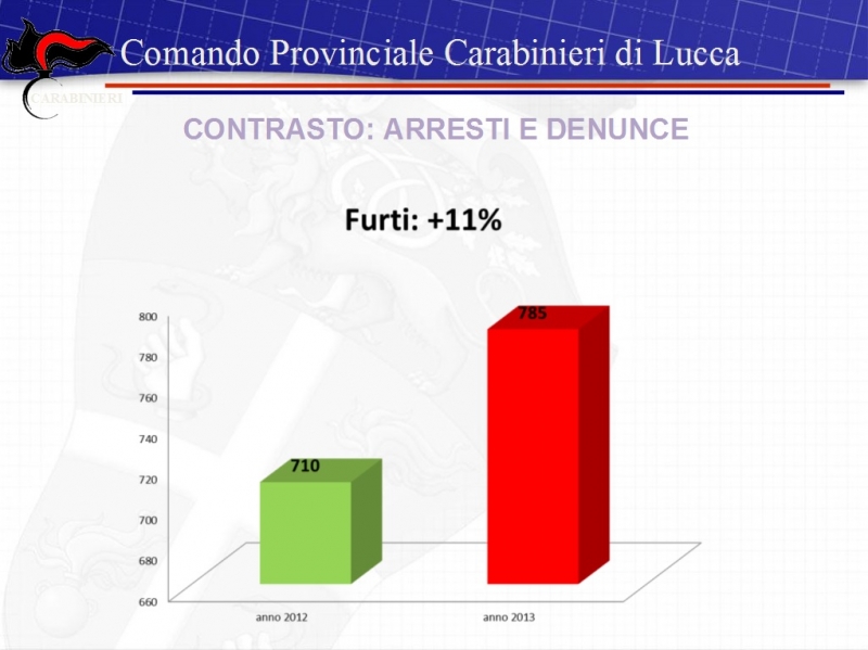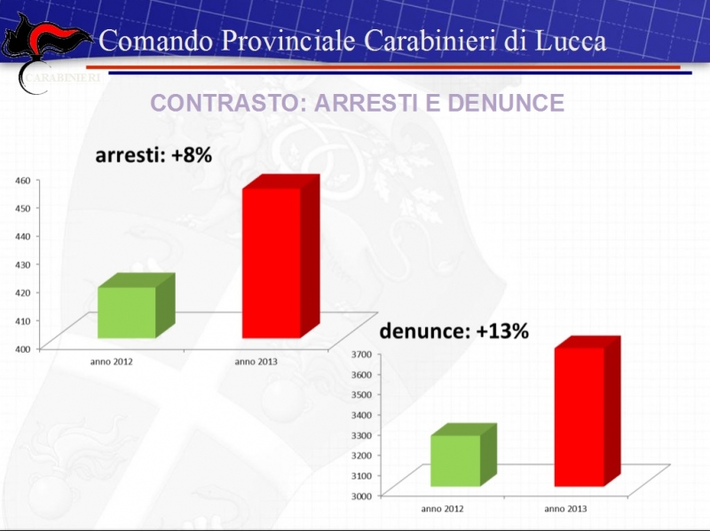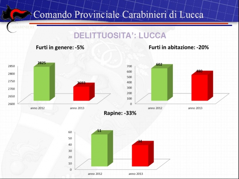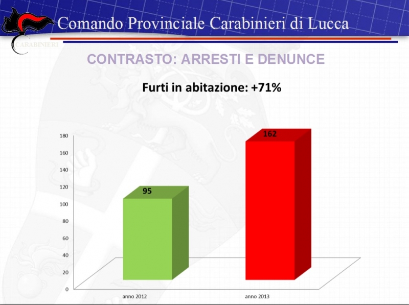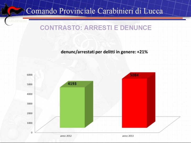 Ma a fronte di una diminuzione complessiva della delittuosità su tutto il territorio lucchese si può notare comunque un aumento degli arresti e delle denunce. Risulta dunque evidente l'egregio lavoro svolto dall'arma nell'anno appena conclusosi che, oltre ad aver messo in atto un piano di prevenzione che ha portato ottimi risultati è al contempo riuscita ad identificare un maggior numero di responsabili dei crimini.
