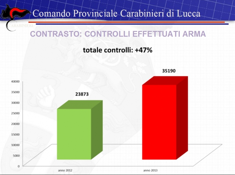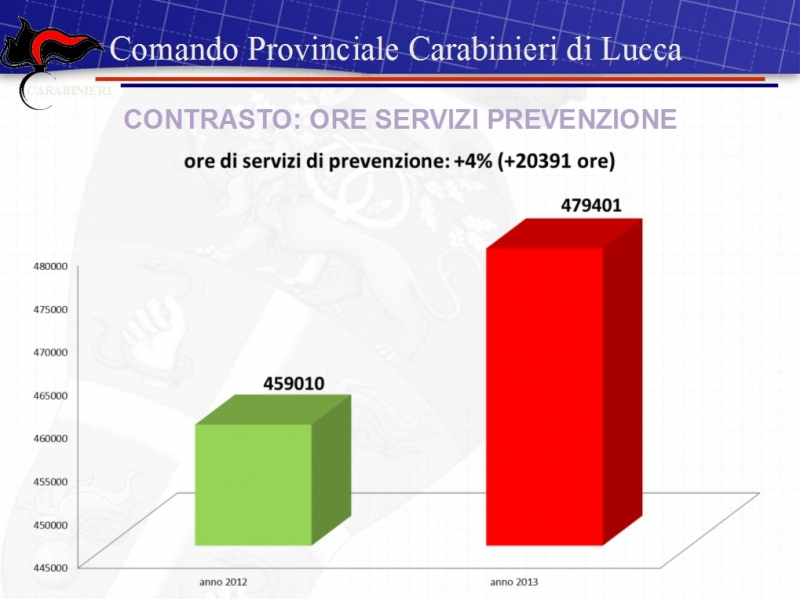 Nonostante le risorse economiche ed umane siano rimaste immutate rispetto al 2012 le pattuglie dei Carabinieri della Provincia di Lucca hanno effettuato circa un 50% in più di controlli ed oltre 20.000 ore aggiuntive di servizi di prevenzione.