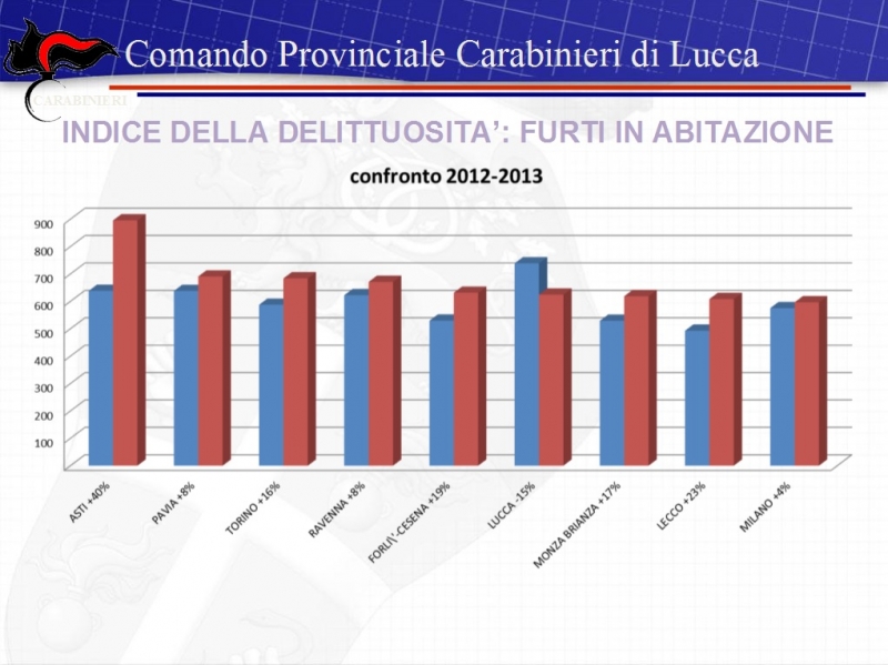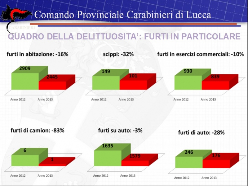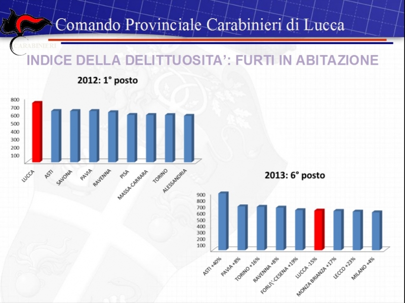 Lucca, che nel 2012 si piazzava purtroppo in testa alla classifica delle città italiane per concentrazione di furti, scivola finalmente al 6° posto nel 2013. Da evidenziare inoltre che è l'unica provincia a registrare un dato col segno negativo: la tendenza infatti di quest'ultimo anno ha registrato un forte incremento di furti nella altre città dello stivale.