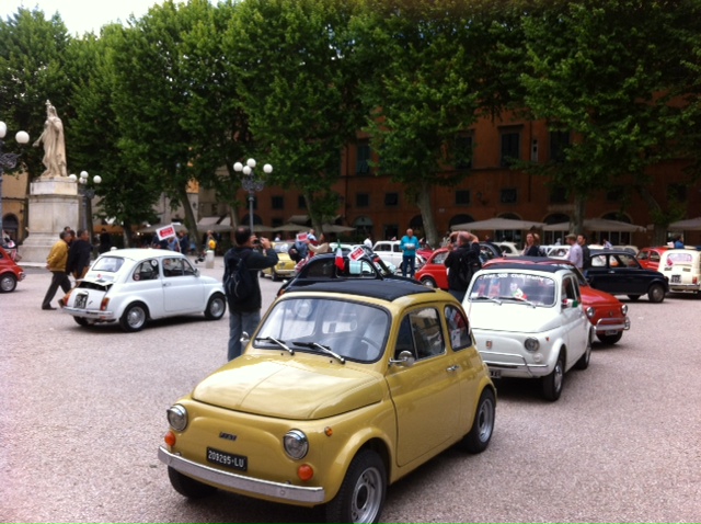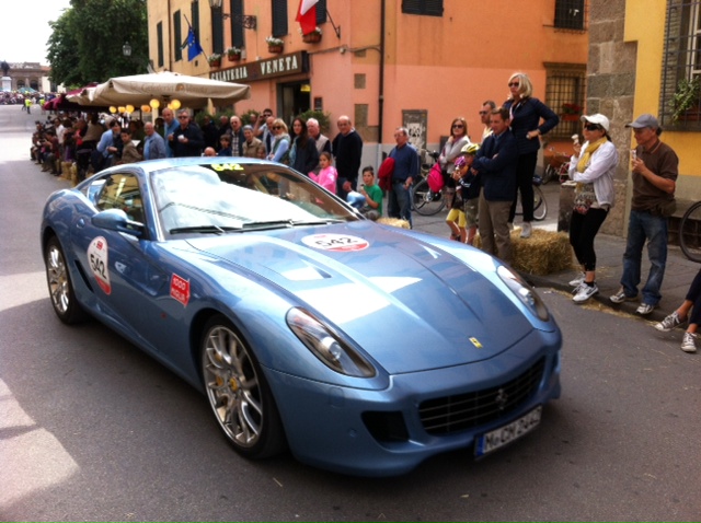 Ad anticipare l’arrivo degli equipaggio delle Mille Miglia e dunque ad aprire la manfestazione sono state invece 80 Ferrari – Mercedes Tribute che hanno sfrecciato sotto Palazzo Ducale, tra 50 vecchie Fiat 500 disposte in modo da formare il numero 500, per onorare l’anniversario delle Mura Urbane.