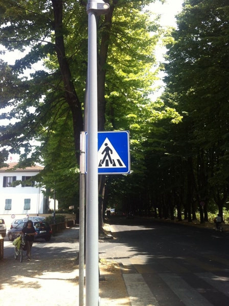 Per illuminare i cinque attraversamenti pedonali nelle immediate vicinanze del centro storico è stata scelto un sistema di illuminazione di ultima generazione, che unisce a elevati standard di sicurezza notevoli vantaggi dal punto di vista del risparmio energetico. Il sistema utilizzato permette in effetti una identificazione precisa del pedone da parte del conducente che sopraggiunge nei pressi dell’attraversamento e al contempo garantisce una visibilità elevata a chi incede a piedi sulle strisce. Le due lampade collocate nei pressi degli attraversamenti sono inoltre dotati di un sistema a led, che segnala agli automobilisti l’approssimarsi di un attraversamento pedonale.