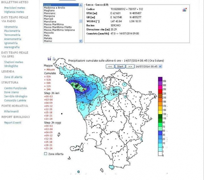 Di seguito il grafico pluviometrico del Centro funzionale di monitoraggio della Regione Toscana. Risulta subito evidente la concentrazione di precipitazioni sulla zona nord e in alcune aree della provincia di Lucca.