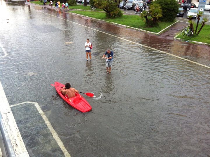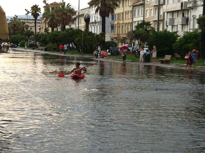 La quantità di pioggia caduta in poco tempo, ha reso strada e passeggiata di Viareggio veri e propri corsi d'acqua, causando danni anche ai negozi della zona che sono stati allagati.