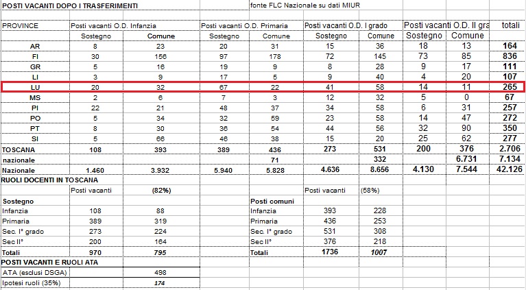 Secondo fonte Flc Cgil nazionale/Miur, sono 2.706 le cattedre vacanti in tutta la Toscana, dalla scuola dell'infanzia a quella secondaria di secondo grado, tra tutte le province. Di queste 2.706, 970 sono sul sostegno (ipotesi posti a ruolo all'82%), mentre per le altre 1.736 di docenze comuni l'ipotesi posti a ruolo è al 58%. Capitolo Ata: posti vacanti 498, ipotesi ruolo al 35%.