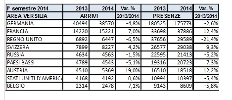 In Versilia la tendenza risulta differenziata: dati negativi per arrivi e presenze per Regno Unito, Germania, Russia, Paesi Bassi e Stati Uniti. Positiva, invece, per le provenienze da Francia, Svizzera e Austria