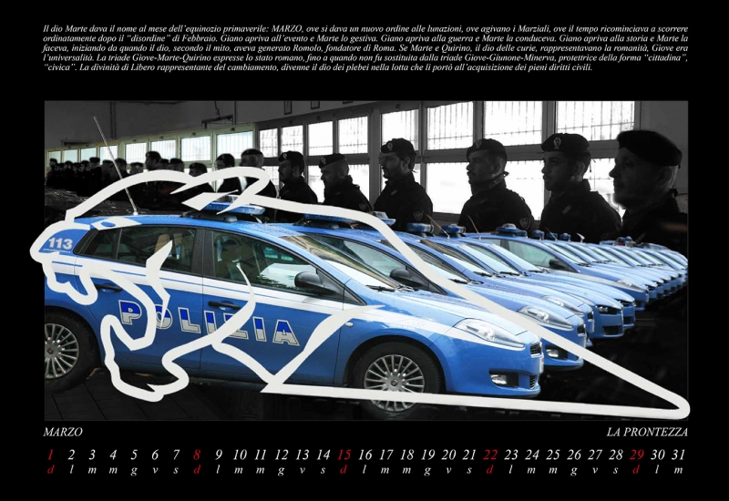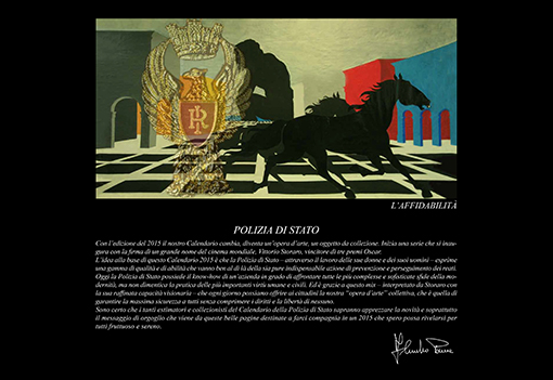 Si tratta di un calendario che rompe la tradizione dei calendari della Polizia, raccogliendo dodici scatti d’autore, con cui il maestro ha deciso di rappresentare il tema delle abilità che il poliziotto quotidianamente mette al servizio del cittadino.