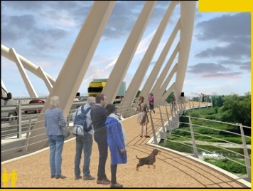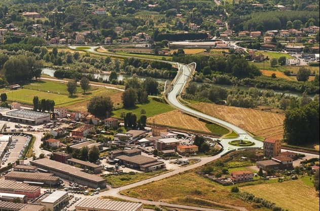 Il progetto prevede la costruzione di un viadotto in acciaio a via inferiore con impalcato sostenuto da tre arcate in sequenza, di luce rispettivamente: 80 m, 100 m e 80 m. che si susseguono con andamento alternato (aperto, chiuso, aperto). Il collegamento viario è completato da una tratta di viadotto per l’attraversamento della golena sinistra e di rilevato di collegamento alla sp 1 Francigena (via per Camaiore) in sponda destra. Sia sulla Sp n. 1 che sulla Ss12 saranno realizzate rotatorie di innesto alle viabilità esistenti. Al percorso veicolare del ponte si affianca, inoltre, una doppia pista ciclopedonale posta in sede separata e protetta che collega le due direttrici e si integra ai percorsi ciclopedonali esistenti sul parco fluviale.
