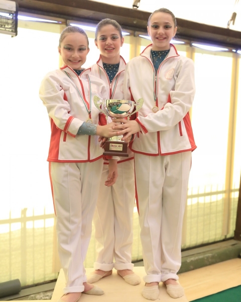 Ancora un primo posto per Beatrice Rosati, Francesca Martinelli e Angelica Frediani che nell’esercizio squadra Palle, si sono messe alle spalle anche una società blasonata come l’Etruria Prato e un ottimo secondo posto per Emma Cavallini, Beatrice Rosati, Francesca Martinelli,  nella classifica delle squadre al Corpo Libero. Nella categoria Junior buon 6° posto per la coppia Cerchio Palla per Tina Sassetti e Giulia Graziani, confermati da un 6° posto ancora per Sassetti nell’individuale Clavette e un 9° posto per Graziani al cerchio.