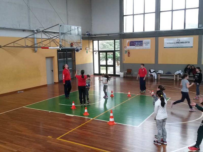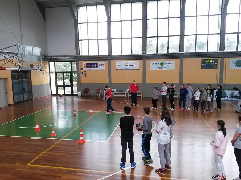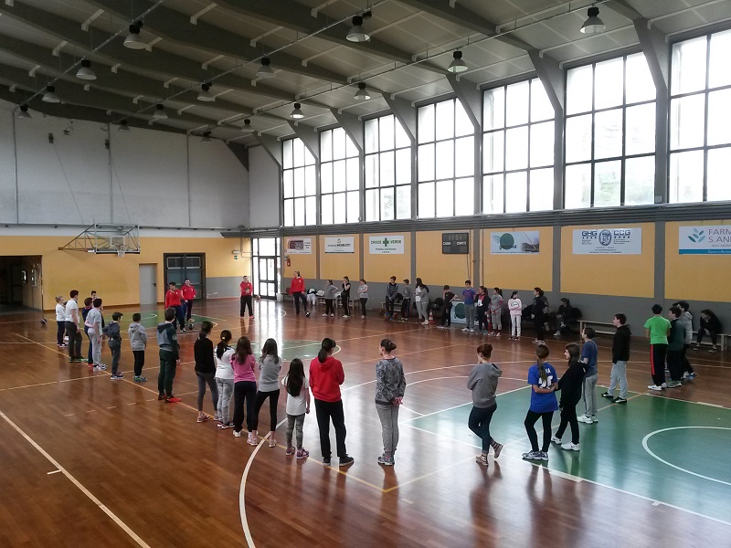 Martina Crippa, ElisaTemplari, Veronica Perini e Kayla Pedersen hanno così insegnato agli studenti alcune regole fondamentali del basket, preparato con loro le fasi del riscaldamento 'pre partita' e organizzato la consueta sfida a canestro a squadre.