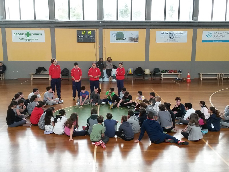 Come promesso alcune giocatrici biancorosse si sono nuovamente recate alla palestra di San Concordio per incontrare gli alunni di due classi medie dell'istituto Leonardo Da Vinci di Lucca, per una intensa e intera lezione di basket giocato, all'interno del progetto scuola 'Sportgate' 2014/2015, organizzato dal Basket Femminile Le Mura con il supporto degli sponsor Veneto Banca, Gesam Gas & Luce e Salt.