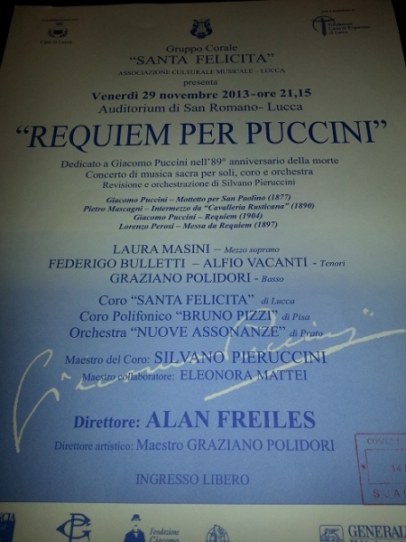 Il programma vede quattro momenti principali: il Mottetto di San Paolino di Giacomo Puccini, dedicato ai 500 anni delle mura di Lucca, l’Intermezzo da “Cavalleria Rusticana” omaggio per il 150° anniversario della nascita di Mascagni, Requiem di Giacomo Puccini per il secondo centenario della nascita di Giuseppe Verdi presentato con una elaborazione orchestrale di Silvano Pieruccini e, infine, la Messa da Requiem di Perosi, per l’89° anniversario della morte di Puccini.