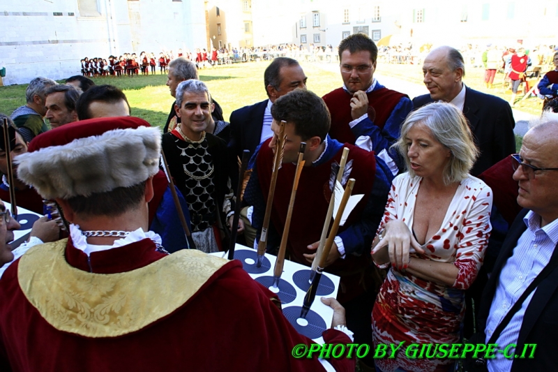 In una splendida giornata di fronte ad un buon pubblico e con molte autorità presenti, tra cui il Ministro dell'Istruzione, la lucchese On. Stefania Giannini, il Prefetto Giovanna Cagliostro e il Sindaco Alessandro Tambellini i corteggi storici delle tre città sono entrati in Piazza e dopo essersi schierati hanno ricevuto la benedizione dell'Arcivescovo di Lucca, Mons. Italo Castellani